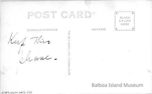 The postcard was never sent and the message on the back just says Keep This Please. It was published by Frasher's Inc. in Pomona, California. Published between 1930 and 1950. Printed on EKKP silver chloride emulsion paper.Collection