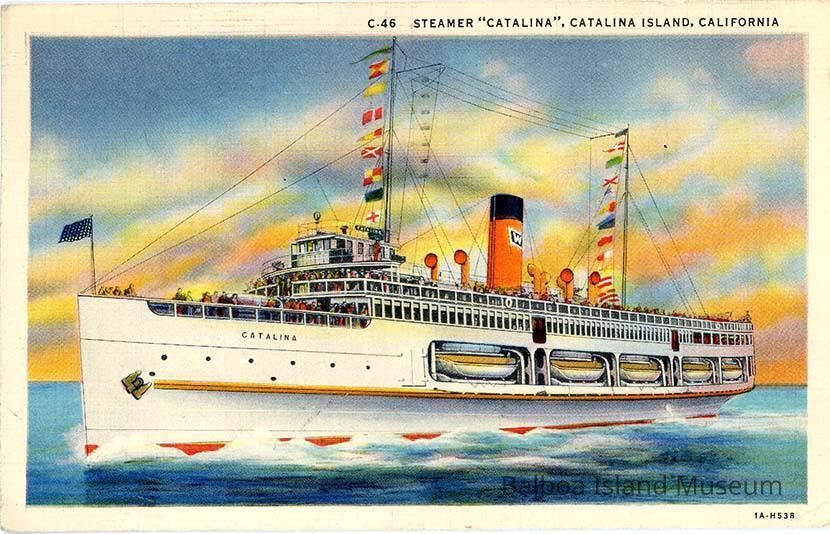 A colorized photograph of the Catalina Steamer under power on the open ocean. The photograph was taken from the bow of the ship looking towards the stern.