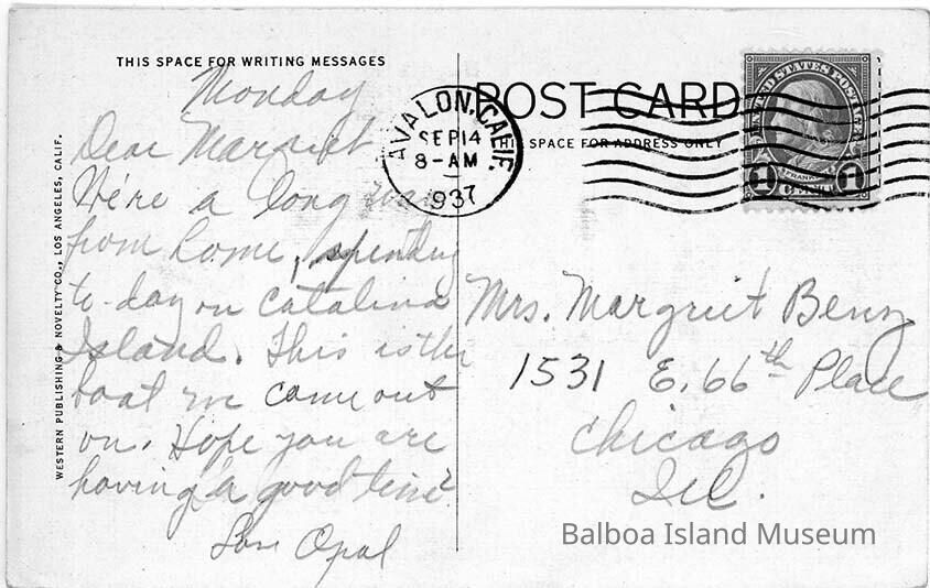 Sent on September 14, 1937 from Avalon, California to Mrs. Margreit Benz in Chicago, Illinois. Published by Western Publishing & Novelty Co. Printed by Curteich-Chicago in 1931. Printed from a black and white negative using a five color process. Postcard publisher number C-46 and postcard printer number 1A-H538.Subject