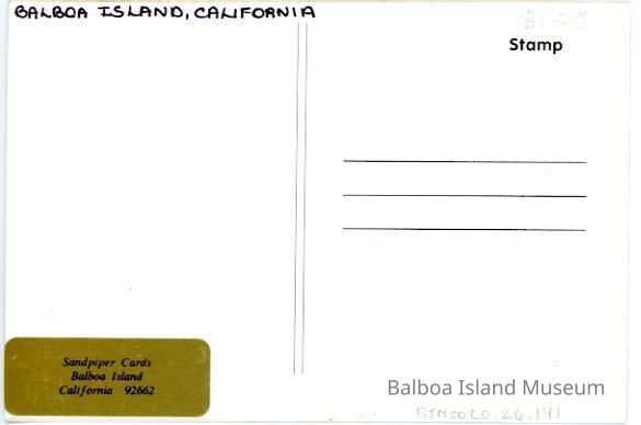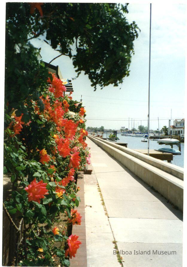 A thick, heavy postcard made locally that appears to be a photograph glued to a piece of backer board. More recent in age. Taken along hte 100 block of Grand canal in front of a house with a large row of rosebushes between the patio and Grand Canal boardwalk. No publisher, printer, or photographer. Sold by Sandpiper Cards on Balboa Island. Vertical print.Subject