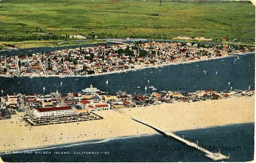 A colorized postcard based on an aerial image of the Balboa Peninsula and Island. The Rendevouz Ballroom and the Pavilion are both visible along with the Balboa Pier.