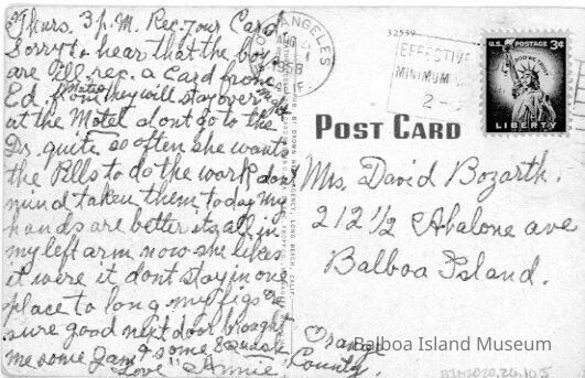 Thurs. 3 pm Rec your card. Sorry to hear that the boys are ill. rec a card from Ed. [----] they will stay over night at the Motel. About to go to the Dr. Quite so often she wants the pills to do the work don't mind taken them today my hands are better its all in my left arm now she likes it were it don't stay in one place to long my legs are sure good next door brought me some [---] and some squash. Love "Annie"Language