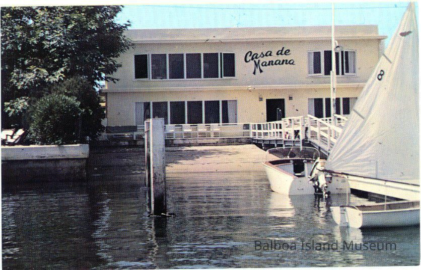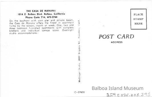 A color postcard of the Casa de Manana, an apartment building on a beach area with a pier. Previously located at 1014 E. Balboa Blvd. It appears to have been torn down.