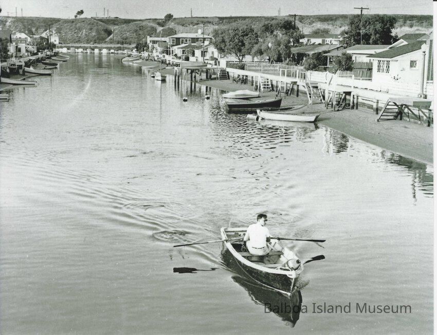 A photograph of a young man in a row boat heading down the 300 block of Grand Canal.Collection