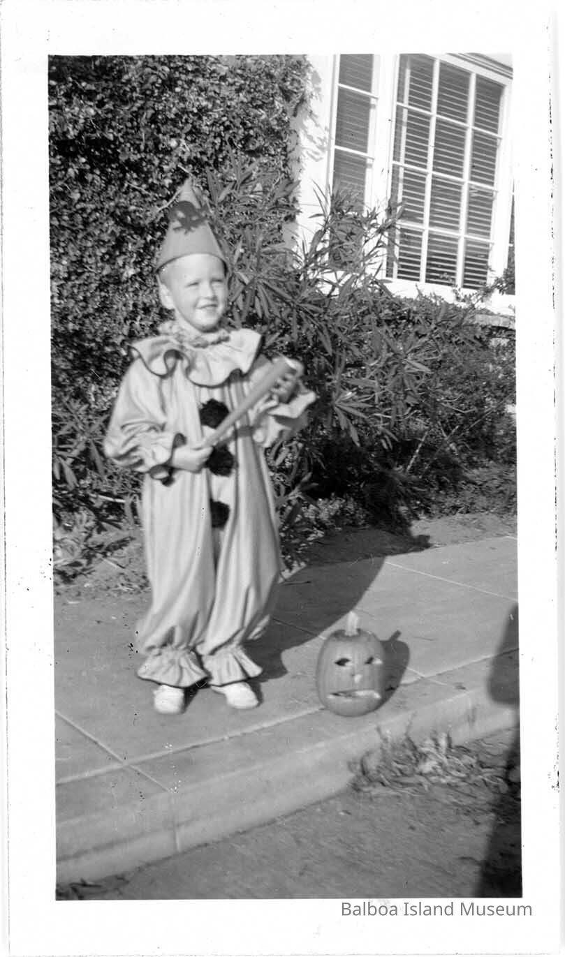 A black and white photograph of Gary Caldwell dressed as a clown, presumably for Halloween. He is standing beside a small carved pumpkin and holding a small baseball bat or club.