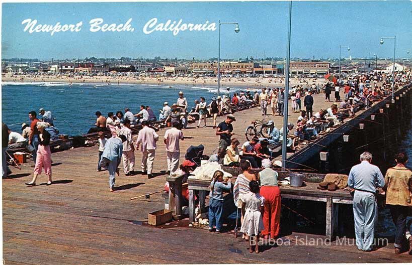 A color postcard of people fishing from the Newport Pier taken in 1956 by Geo Watson. The photograph was taken from the end of the pier looking down and a long table where people are preparing their lines or fish can be seen on the right side. Looking towards the beach.