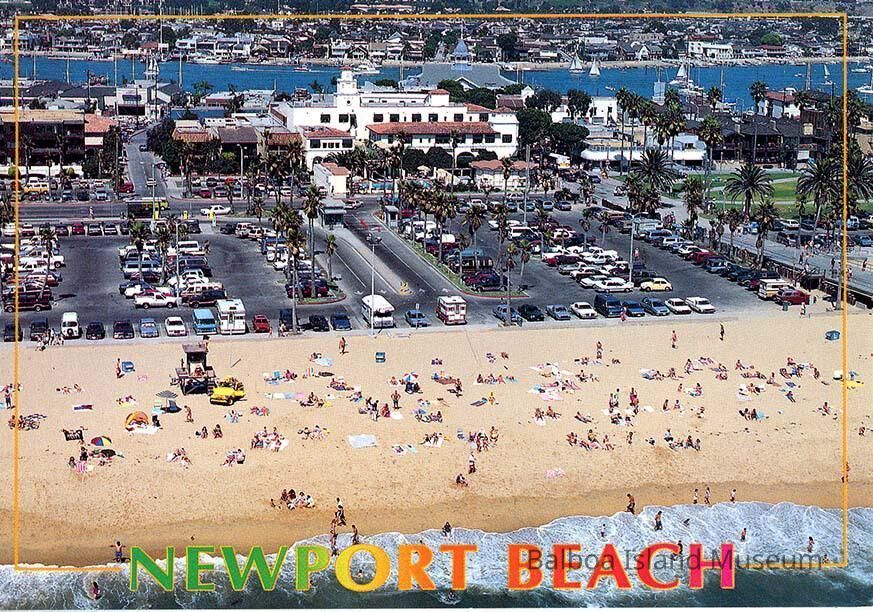 A color aerial postcard of Balboa beach with the parking lot and Balboa Inn behind it. The Pavilion roof is also visible. Taken from over the ocean looking north. There is a gold/yellow line offset from the edge that acts as a kind of frame, with the words Newport Beach in rainbow block letters at the bottom interrupting the line. Two copies