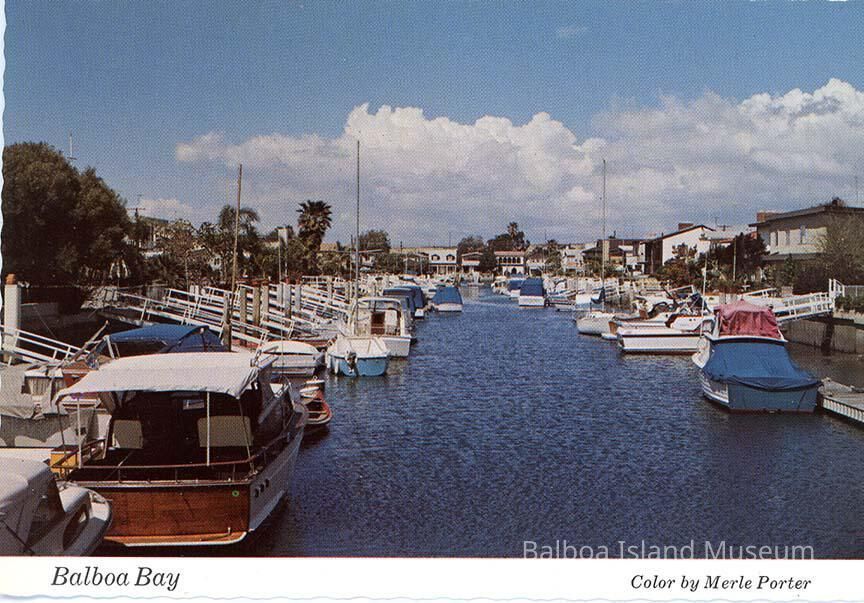 A color photograph of one of the channels around Newport Island with boats docked to either side. There is a small white banner on the bottom that reades "Balboa Bay Color by Merle Porter". The card has a deckle (ragged/crimped) edge.