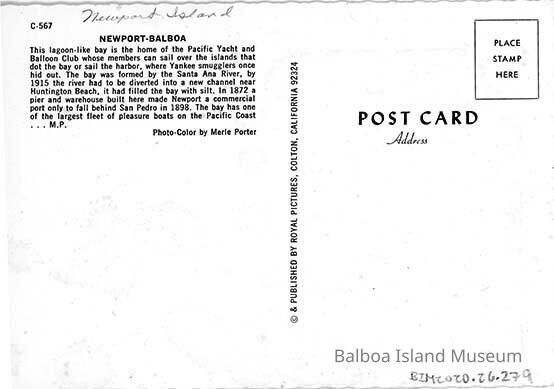 Unused. The back notes this is the Newport Island area. There is a small paragraph about the area written by Merle Porter. Photograph by Merle Porter, published by Royal Pictures in Colton, California. Postcard number C-67.Subject Place