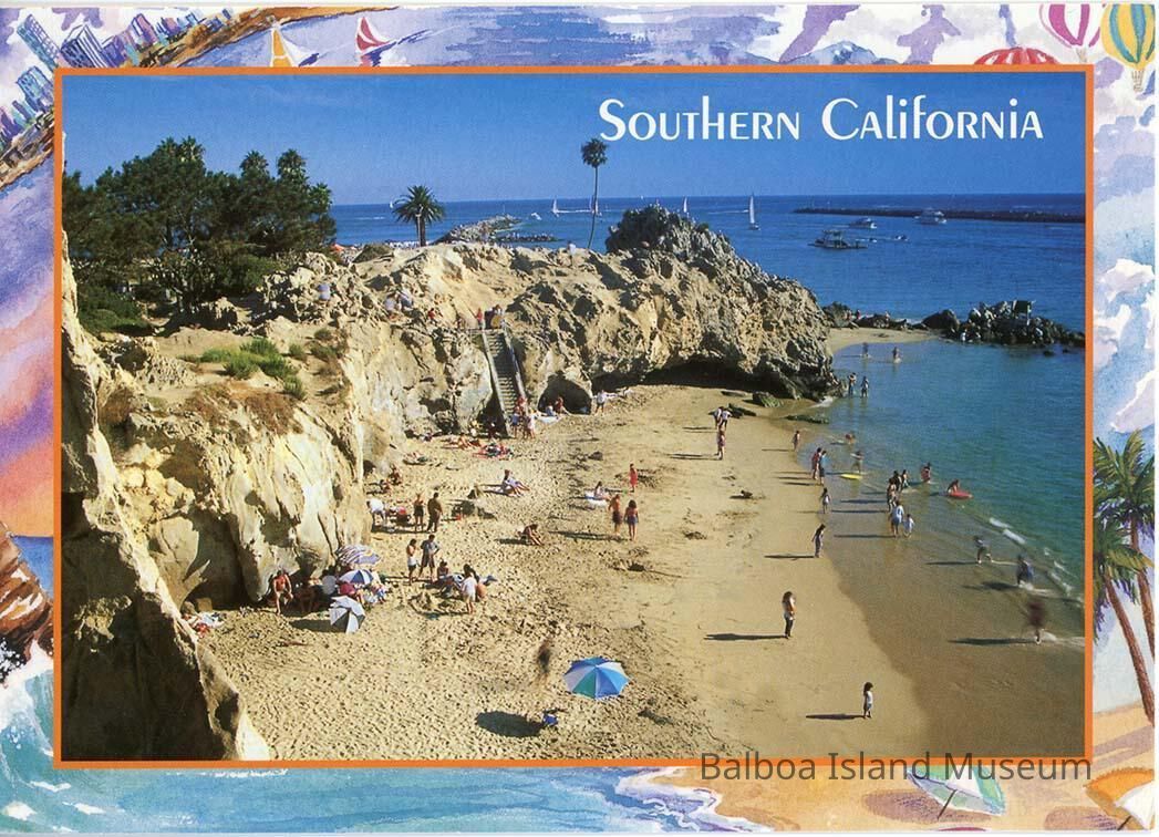 A large color postcard of Pirate's cove with people playing in the surf and on the sand. There is a color boarder around the image with small paintings of the city skyline, waves hitting rocks, hot air balloons, and a beach with sand.