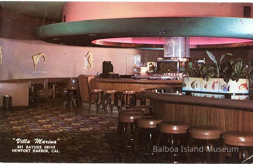A photograph of the inside of the Villa Marina restaurant at 801 Bayside Drive. The photograph displays the inside bar area, featuring rounded bars and tables with backless stools surrounding the counters and booths along the curved internal wall. Fish décor and designs decorate the area.