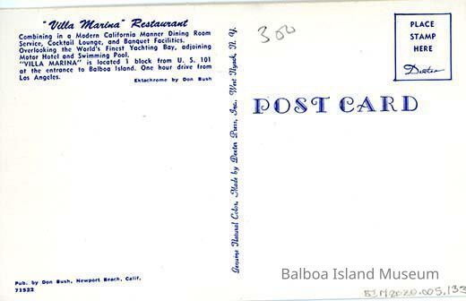 Two copies, neither used. The backs contain a small blurb about the Villa Marina Restaurant. The photograph (Ektachrome) was taken and published by Don Bush. Printed by Dexter Press. Number 71522.Subject