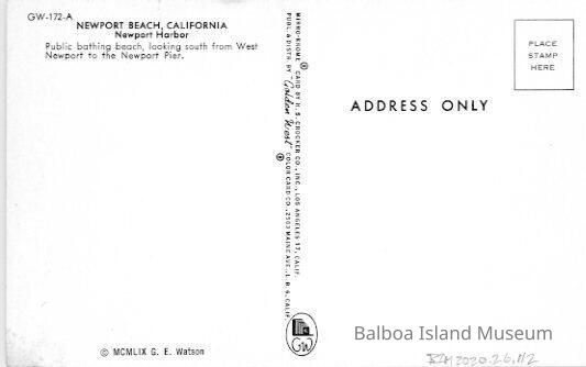 Published by Golden West of Long Beach. Printed by H. S. Crocker Co., Inc of Los Angeles. Photographed and copyright by George Elton Watson, 1959. Postcard number GW-172-A.Subject