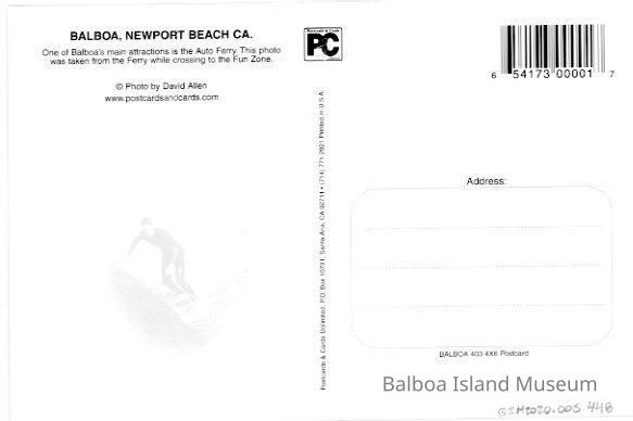 Two copies of a color photograph postcard of the Ferry docking at the Balboa Fun Zone. The photograph was taken from the front of the ferry looking at the dock. The fun zone is to the left and the Balboa Boat Rentals are to the right. "Balboa" is written in the upper left corner in bubble letters in white and "Newport Beach" is written below it in white letters inside a black box with rounded edges.