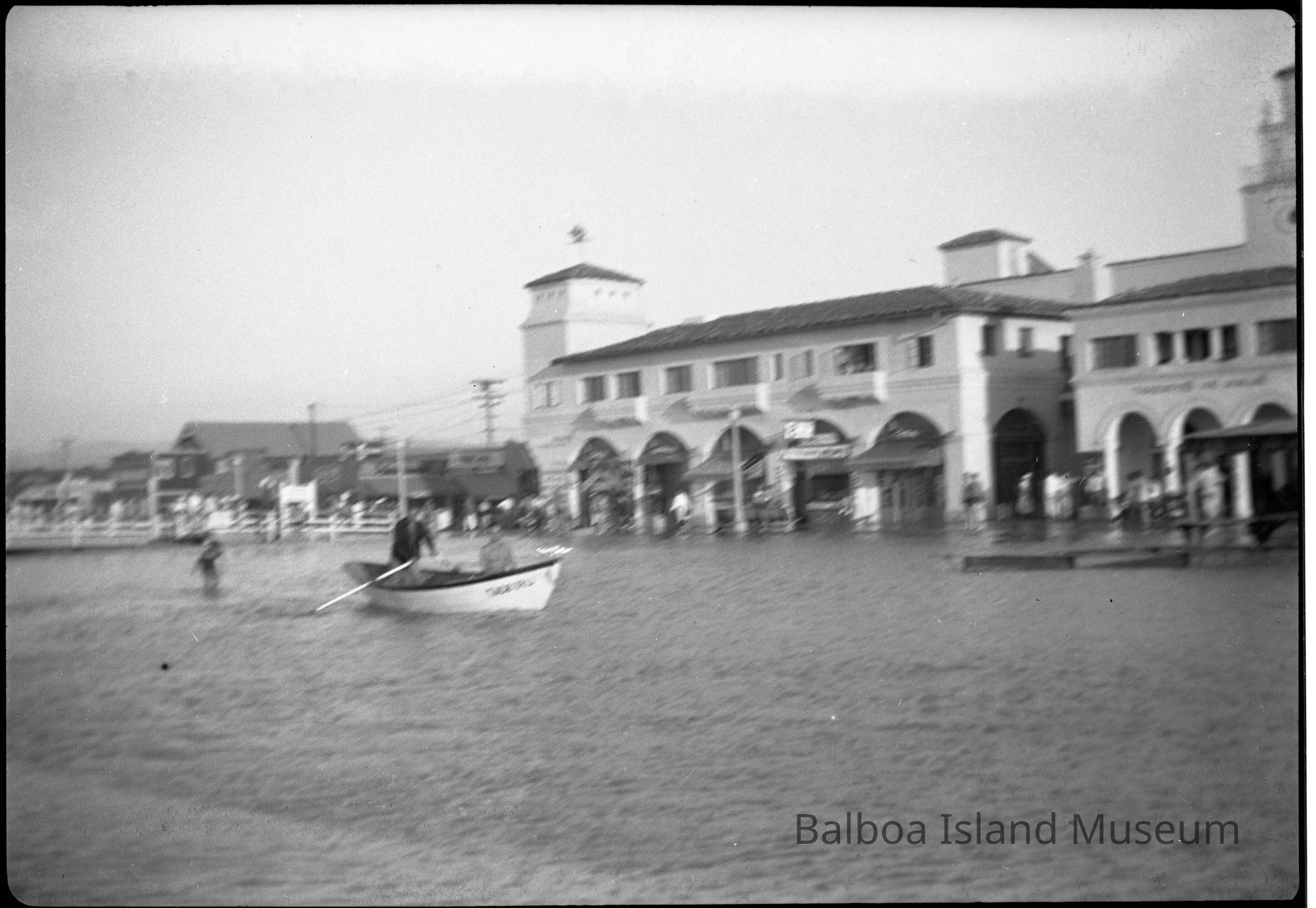 A photo negative of Balboa Peninsula flooded. There is two men using a small boat to move through the water. The envelope holding the negative says "High Waves + Water at Balboa taken in 1934 summer"