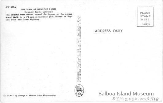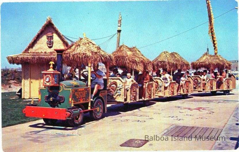 A color postcard of the Newport Dunes train full of passengers passing a tiki hut of some kind.