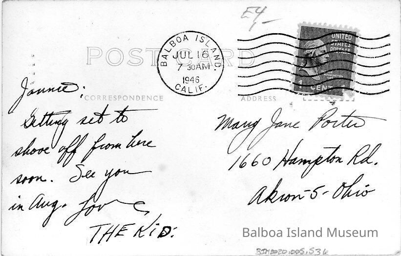 Sent on July 16, 1946 at 7:30 am from Balboa Island to Akron, Ohio. Sent to Mary Jane Portus from "the Kid".