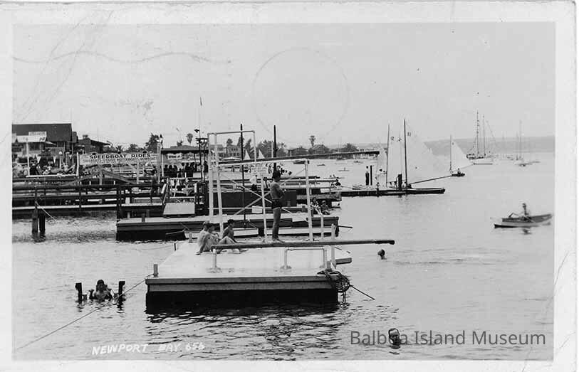 A photograph postcard of the diving platform in the Balboa Fun Zone taken from the side. The speedboat ride place is visible one dock over from the platform. White border.