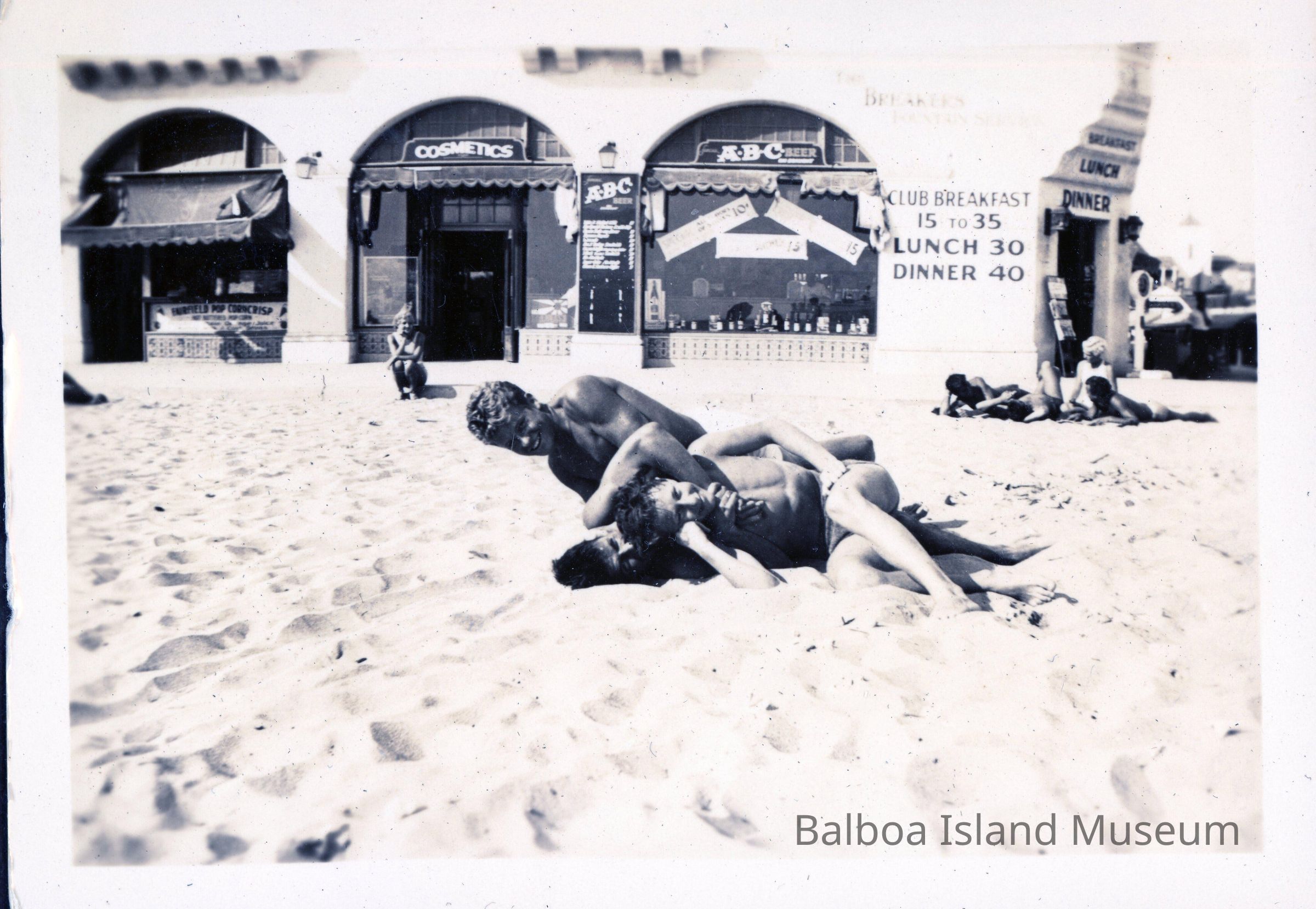A photo of boys rough-housing on the beach by the Balboa pier. The photo was printed and glued into a photo album but appears to be apart of the same day as the negatives in the envelope " The Gang at Balboa Taken 1934 Summer"