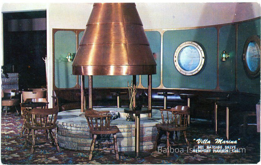 A color postcard of a firepit inside the Villa Marina with a copper flue and chairs at small bar tables around it.