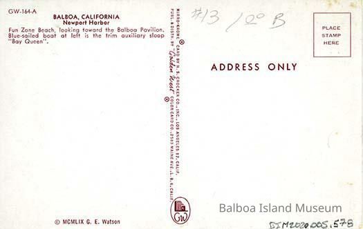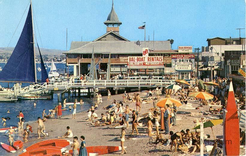 Two copies of a color photograph postcard of the pavilion taken from the Fun Zone beach. The beach is covered in beach goers and there are red paddle boards and kayaks lined up near the water. The U-Drive sign and a sign for Bal-Boat rentals are both visible in the background.