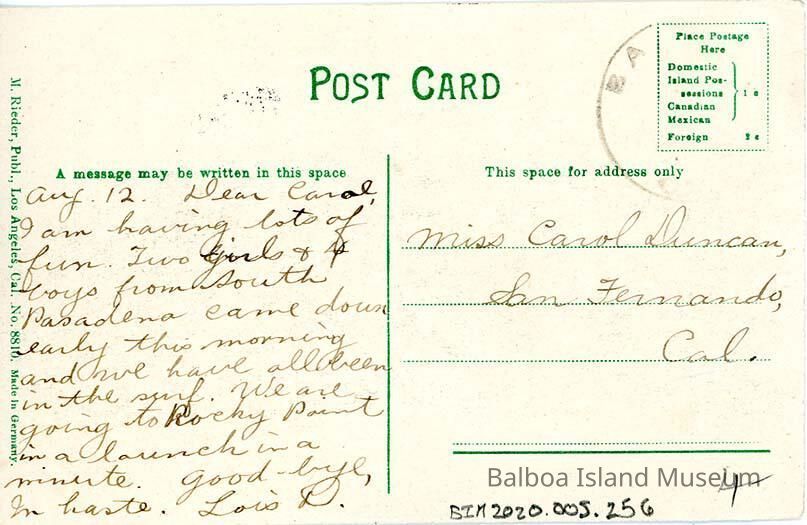 I am having lots of fun. Two girls & four boys from South Pasadena came down early this morning and we have all been in the surf. We are going to Rocky Point in a launch in a minute. Good-by, in haste. Lois D.Language