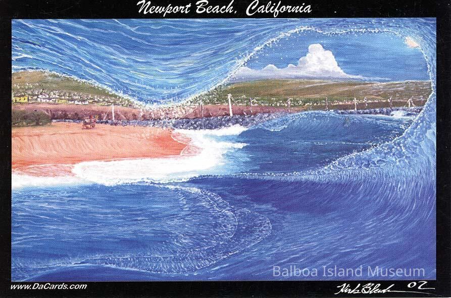 A postcard style print of a painting of the wedge based on a photograph done from inside a wave. The jetty is visible in the background. It was pained from the perspective of someone inside a wave. Artist is Kirk Blesoh [?] and was painted in 2002. Printed using www.DaCards.com.Subject Place