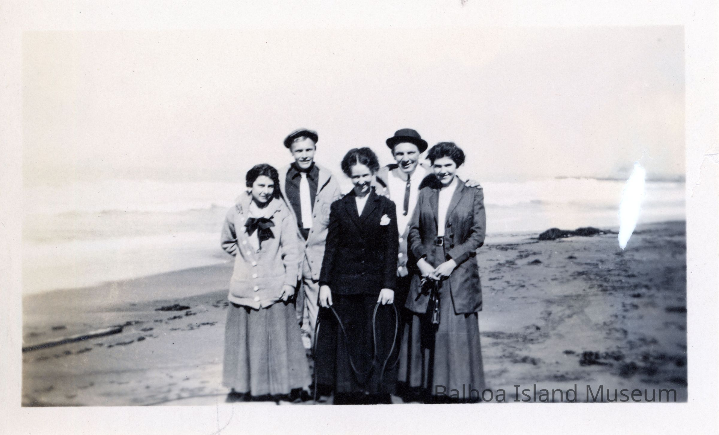 A photograph of a group of men and women standing on the shores of a beach in their standard suits and dresses. This might have been taken at Corona del Mar State Beach. There are three women and two men in the photograph. One of the women is holding a long piece of seaweed or a rope of some kind.