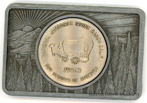 A belt buckle from the 1953 Boy Scout Jamboree held on Irvine Ranch where Fashion Island is now located. The buckle is metal with a National Jamboree coin in the middle. The space around the coin is embossed with mountains and trees resembling a forest scene and a sun rising over the mountains. Made by the Boy Scouts to celebrate the 1953 Jamboree.