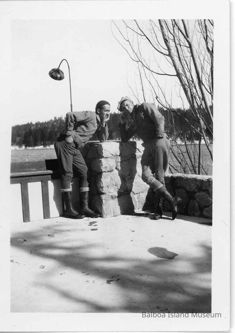 A black and white photograph of Harold Caldwell and an unknown man leaning on a fence pillar at what might be Lake Arrowhead in the middle of winter.