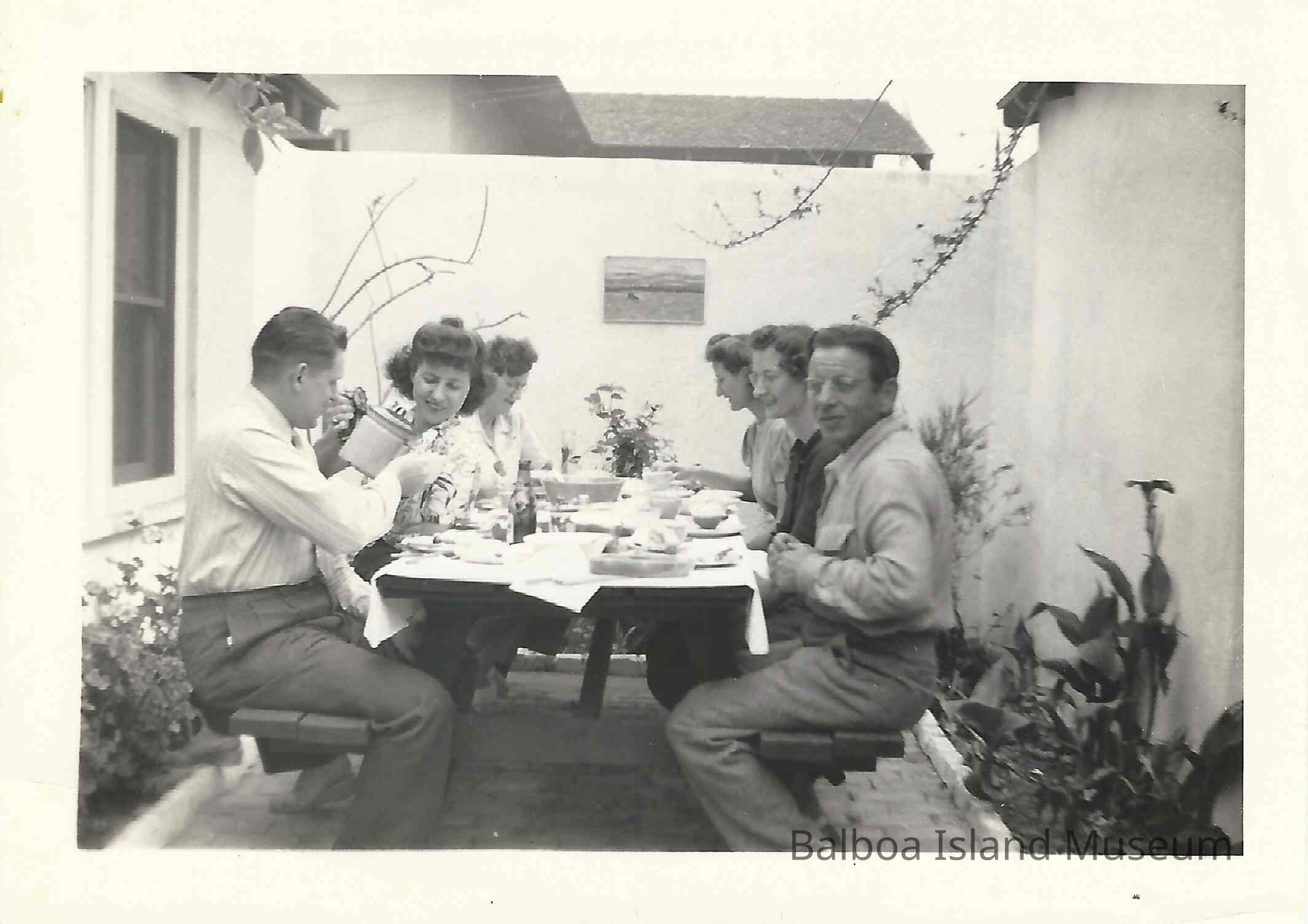 1945 fish dinner on Balboa at Louise Hengstler's mother-in-law's home. From left to right: Ester's husband, Louise Hengstler, Francas Pulaski, Unknown, unknown, Herman Pulaski.Photograph Details