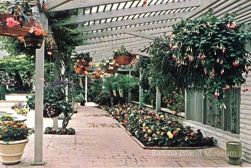 A color photograph postcard of an overhanging trellis with various hanging planters and a long flower bed under the trellis. Possibly taken inside either the specimen shade garden or the tropical conservatory. This is the same area as BIM2020.005.488.