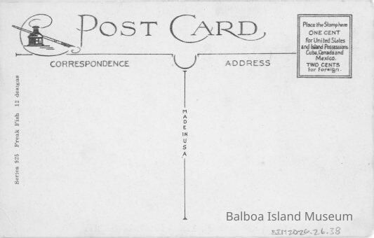 The back is divided into correspondence and address. Made in the USA. Stamp box reads "Place Stamp here one cent for US and Island possessions Cuba, Canada, and Mexico. Two cents for foreign." Series 925, Freak Fish.