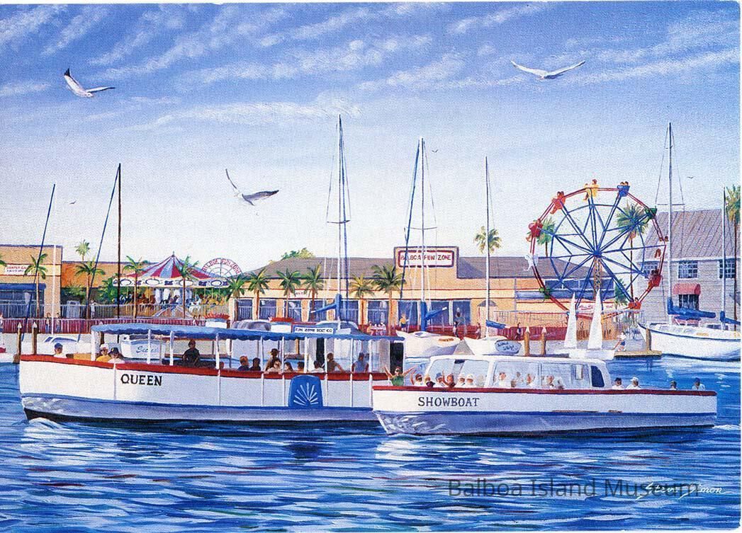 A large postcard with an early painting by Steve Simon of two boats passing in front of the Fun Zone. One is called "Queen" and another is called "Showboat". It was printed as part of a postcard series produce by the City or the City tourist board. The original title was "Fun Zone Boat Co." and was painted in oil on a 24 x 36 inch canvas.
