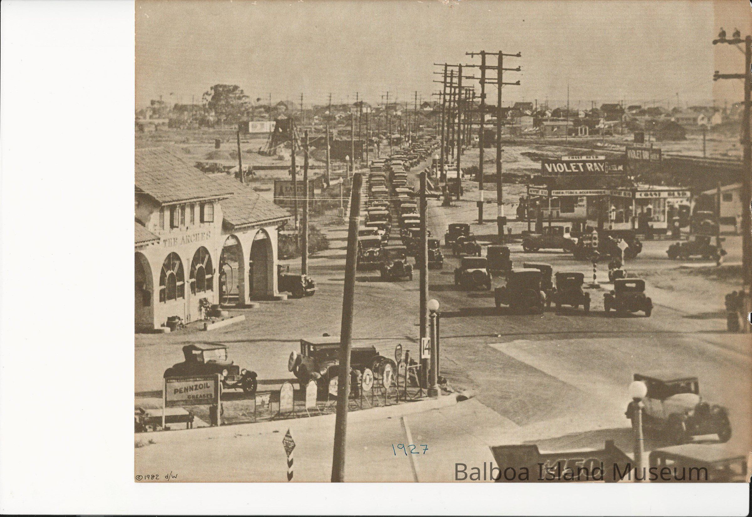 Photograph taken in 1927 including The Arches, a building labeled "Violet Ray", and several cars driving down the road.Lexicon