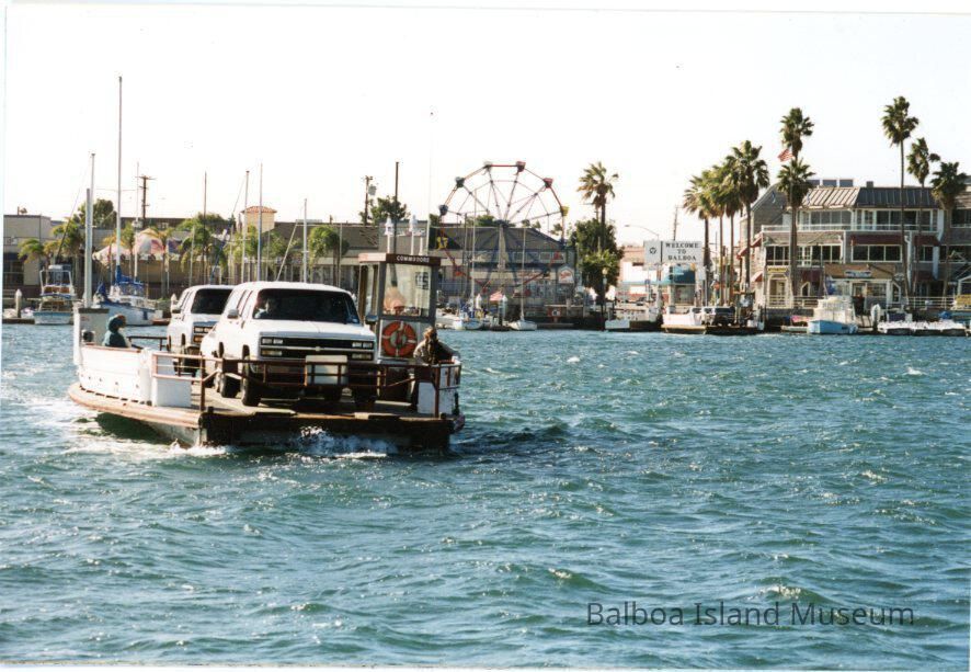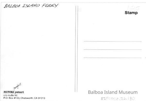 A thick, heavy postcard made locally that appears to be a photograph glued to a piece of backer board. More recent in age. Photograph of the Balboa Island Ferry heading towards the Balboa Island Landing. Taken from on a boat. The Fun Zone is in the background along with the ""Welcome to Balboa"" sign.