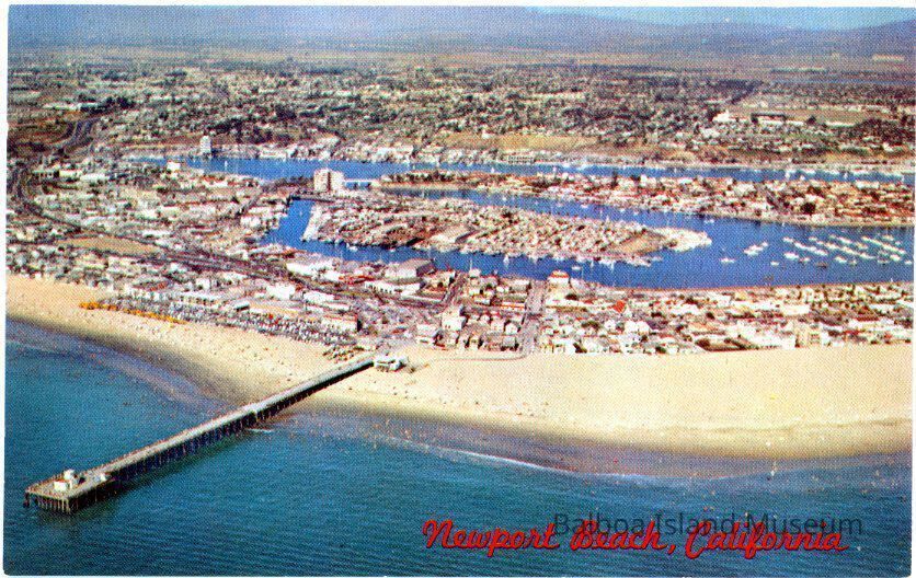 A postcard with a color aerial photograph of the Newport Beach Pier and Newport beach area with Lido Island and Newport Island behind it. Newport Pier is jutting out to the ocean. The title is written along the lower right side in red cursive-style script.