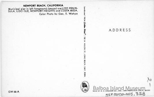 Published by Golden West in Long Beach and printed by H. S. Crocker Co., Inc. Photograph by George E. Watson. Postcard number GW-66-A.Subject