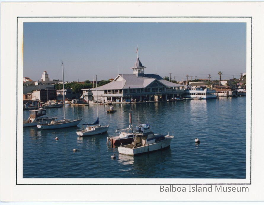 A photograph of the Balboa Pavilion taken from an angle to the west of hte building with five boats, three sail and two motor, moored in the harbor between the Pavilion and the photographer.Collection