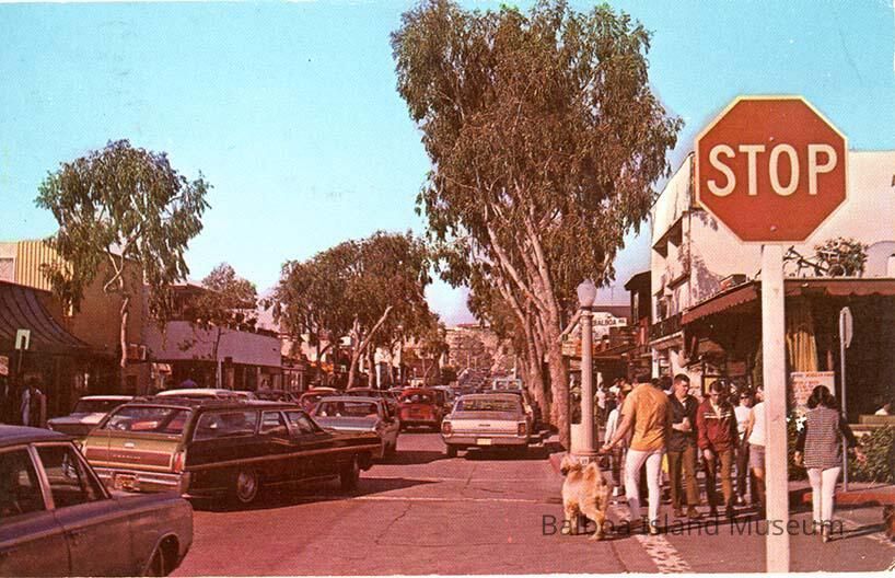 A color photograph postcard looking up marine towards Irvine Terrace along the 300 block. Taken from the right side of Marine with Jamboree plaza visible across the way. Taken at the stop sign in front of what is now Starbucks.