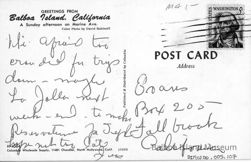 Two copies, one used and one blank. The back is a standard postcard back with the words "Greets from Balboa Island, California. A Sunday afternoon on Marine Ave." written in the upper left corner. The photography is by David Rubinoff, published by Columbia. Postcard number H4064 and 113492.
