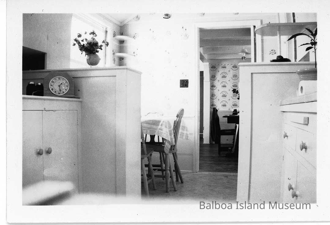 A black and white photograph of the kitchen at 600 Balboa Avenue. It shows the half wall separating the kitchen from the kitchen table and the doorway into the formal dining area.