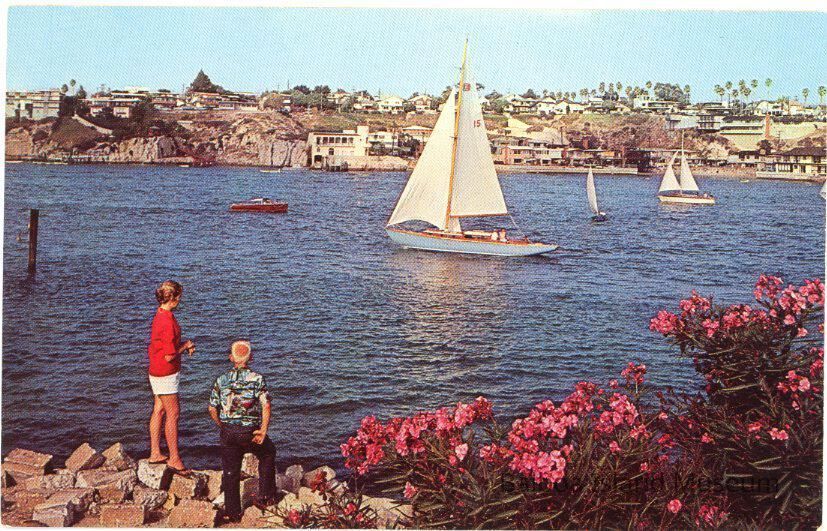 A color photograph of Newport Harbor taken from the Peninsula area across from China Cove with sailboats passing throught the water. There are two people staning on a pile of rocks in the foreground.