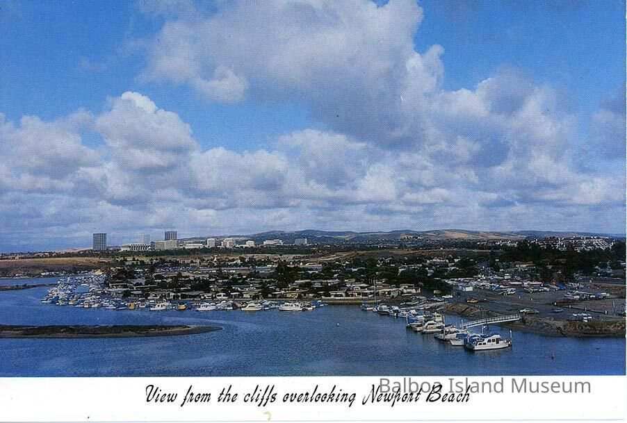 A color postcard featuring a photograph taken from a lower flying plane looking towards Fashion Island. Taken near the Newport Dunes. There is a sand spit and a number of boats docked along the shoreline. Numerous large buildings surround Fashion Island including the Pacific Life building. There is a white banner on the bottom that reads "View from the cliffs overlooking Newport Beach".