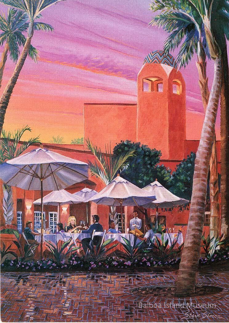 A painting by Steve Simon printed vertically. Shows the patio of the restaurant at the Newport In and one of the classic towers on the building in the background. It was printed as part of a postcard series produce by the City or the City tourist board. The painting was originally named Hyatt Newporter and was painted with oil on a 24 x 36 inch canvas.