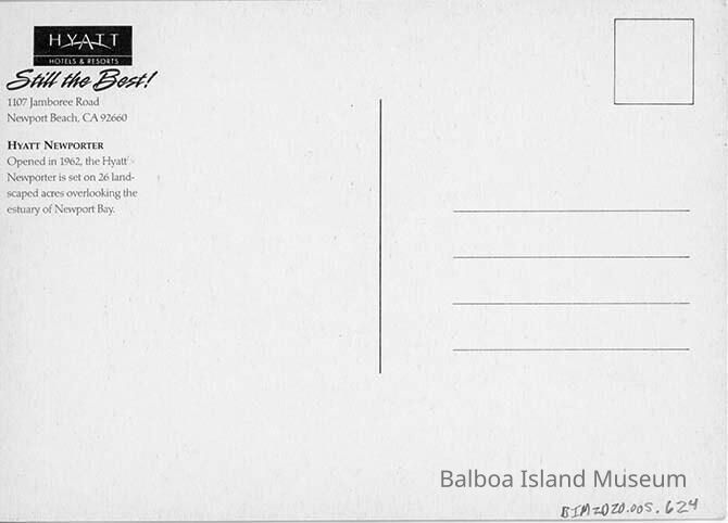 Unused. No publication information. The back has the address and some historic information on the The Hyatt Newporter.Subject