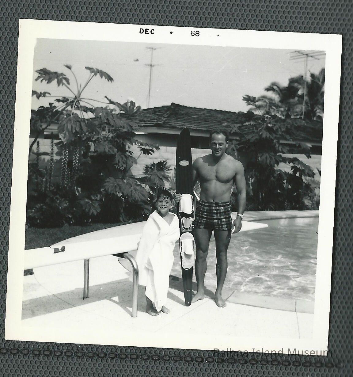 Bert Minshall standing poolside with a young boy