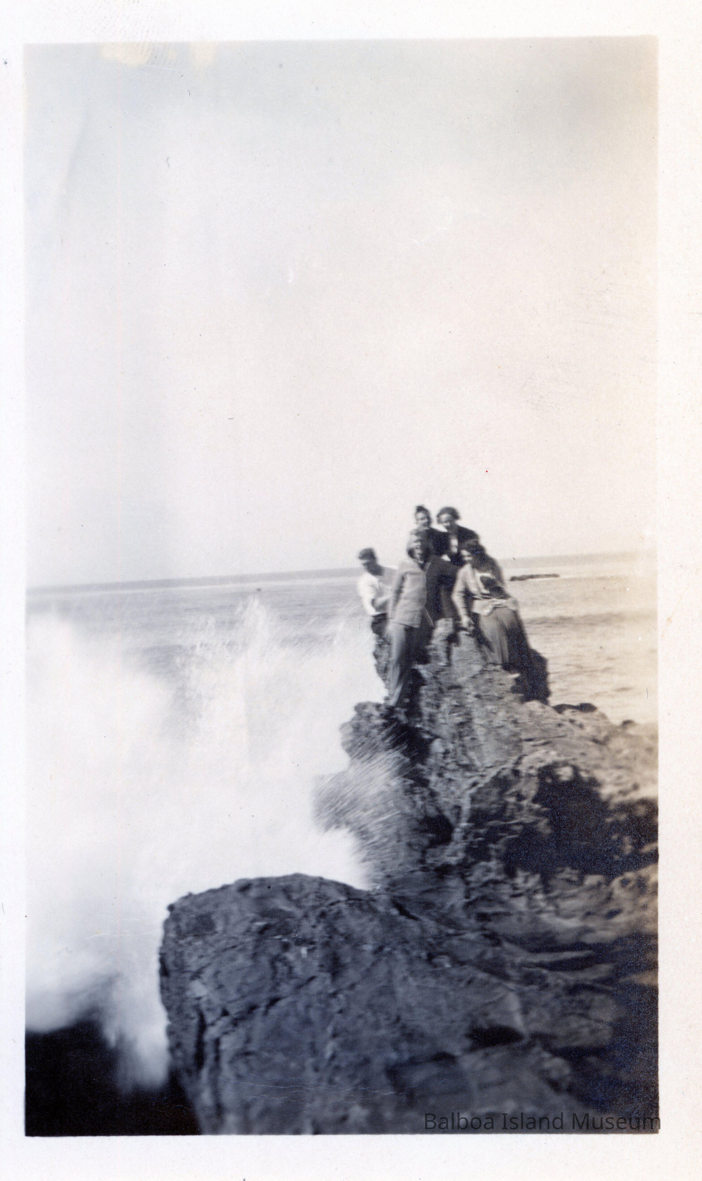A photograph of a group of men and women on a rock in the Corona del Mar state beach wave break. There appear to be three women and two men. One of the men likely got hit with the spray (the one in the white shirt on the left side) and is looking towards where a wave just struck. One of the women is looking at him as well, while the other three are looking at the camera.