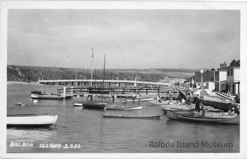 A black and white picture postcard of Balboa Island taken from North bay front in the 1300-1200 block looking towards the bridge. There are a group of boys and girls preparing to leave in a rowboat. They appear to be mounting a outboard motor or trying to get it to start with the boat pulled ashore. They may also be removing it for storage. The bridge is in the background behind several piers. The bottom of the photograph is slightly smudged, likely from the printing process.