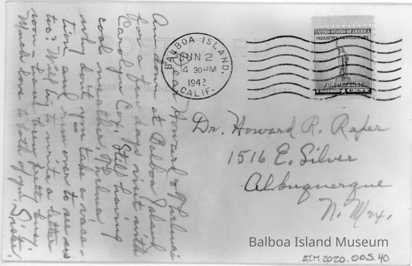 The postcard was sent on June 2, 1942 to Howard R. Rafer in Albuquerque, New Mexico.Subject Place